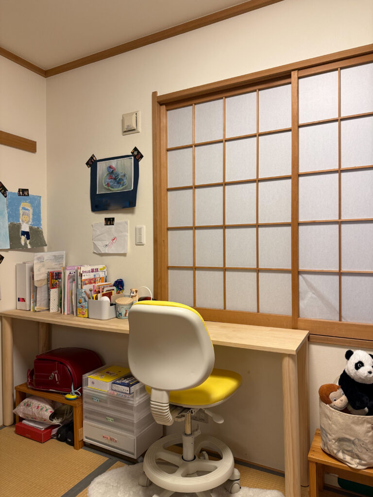 机ゾーンとおもちゃゾーンにしっかりと空間を分けました。机はキッチン・リビングからも見えるように手前に、よく使うおもちゃは1マスの家具を4つ並べて、ますの中に収納。なんだかお子さんがワクワクするような収納にしたかったので箱にラベリングをして収納しました。その奥には、本や2軍のおもちゃ収納を置いてます。